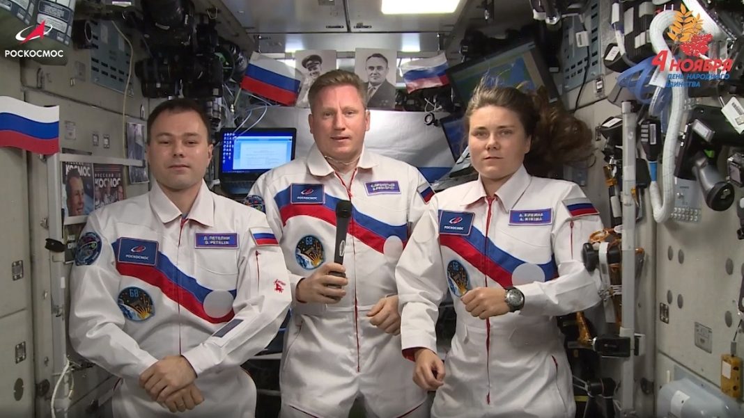 «Дорогие друзья, мы, космонавты Роскосмоса Сергей Прокопьев, Дмитрий Петелин и Анна Кикина, поздравляем вас с Днем народного единства», — сказал Прокопьев.