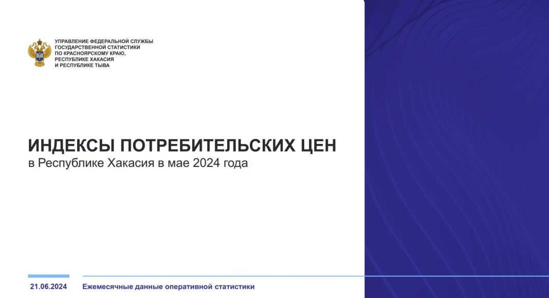 В мае 2024 года индекс потребительских цен в Республике Хакасия по сравнению с предыдущим месяцем составил 100,27%. В частности, на продовольственные товары цены выросли на 0,27%, на непродовольственные товары – на 0,25%, а на услуги – на 0,28%. По сравнению с декабрём 2023 года, общий индекс потребительских цен показал рост на 2,59%, где продовольственные товары подорожали на 3,14%, непродовольственные товары – на 1,44%, а услуги – на 3,64%.