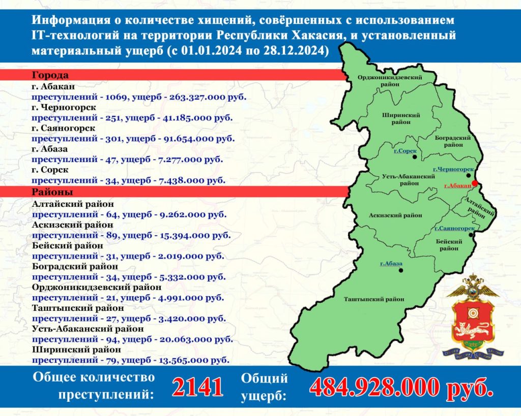 МВД по РХ подсчитали, что с начала 2024 года на территории Республики Хакасия зарегистрировано 2141 преступление, совершенное с использованием информационно-телекоммуникационных технологий.