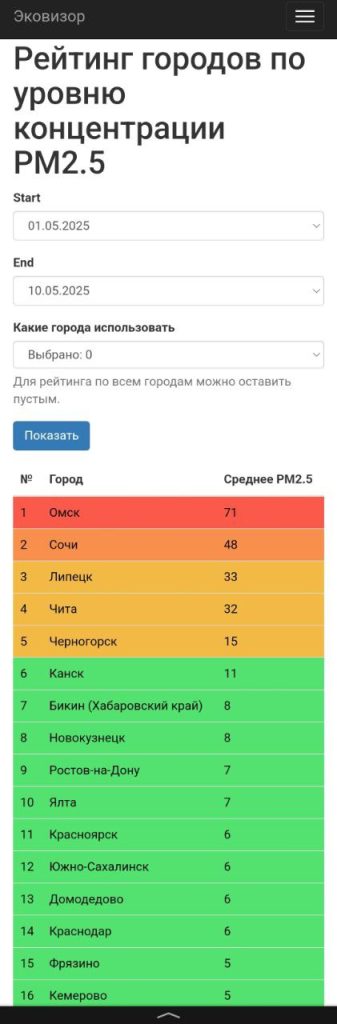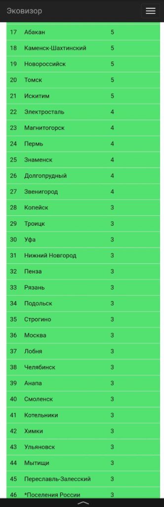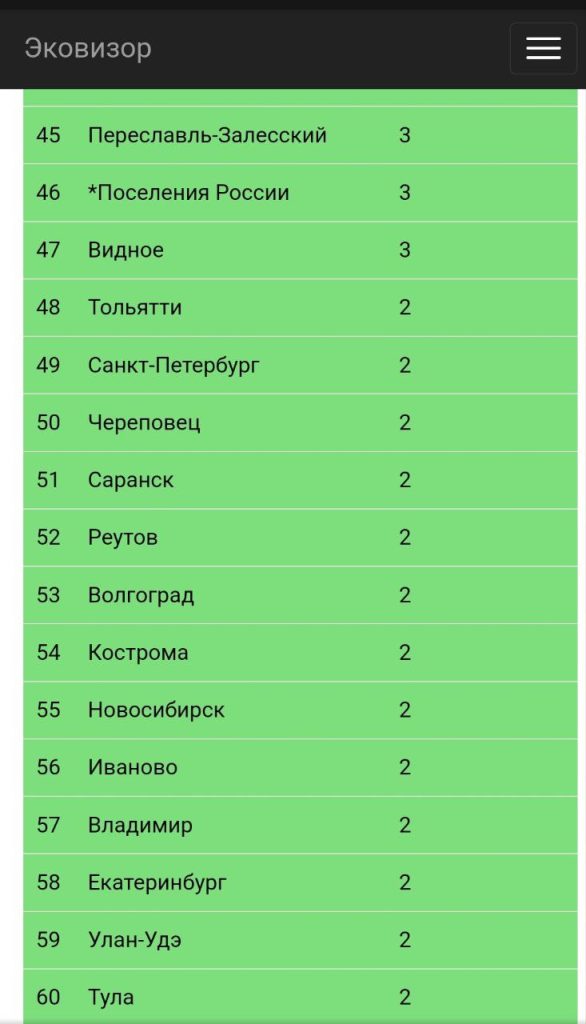 Рейтинг сформирован на основе 542 тысячи 20-минутных замеров мелкодисперсной пыли РМ2,5 с 1037 датчиков Федеральной общественной сигнальной сети качества воздуха «Эковизор», установленных в 60 городах.