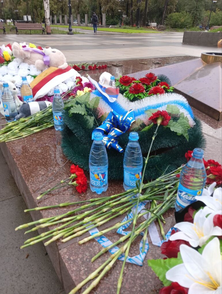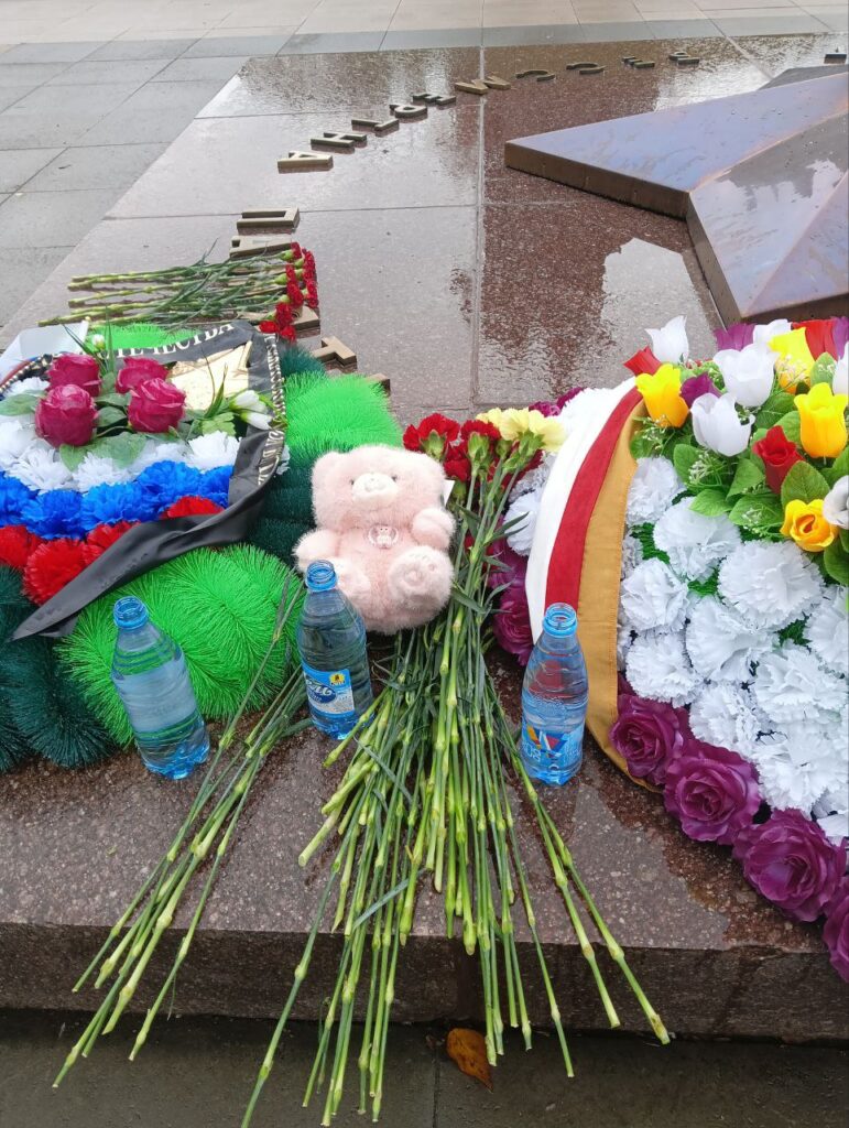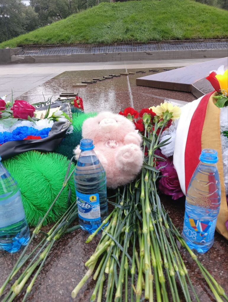 Плюшевые игрушки – весёлые разноцветные зверята, перечёркнуты траурными гвоздиками. Вечный огонь. Вечная память.