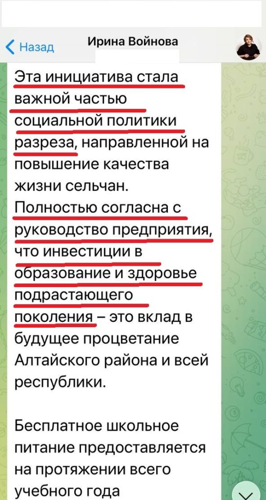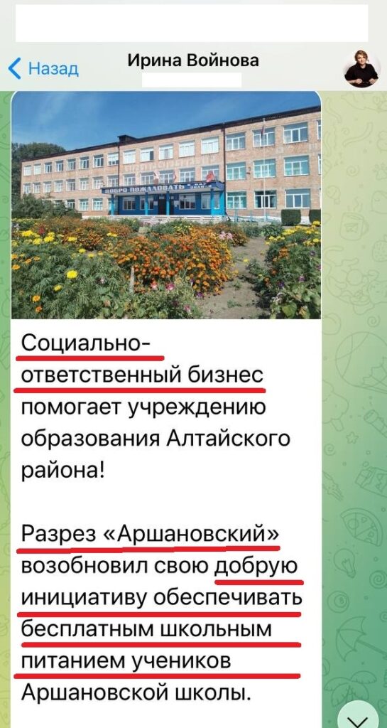 Ещё в августе Ирина Ивановна на своих страницах в социальных сетях писала очень правильные слова о том, обеспечение школьников бесплатным питанием — это добрая инициатива Разреза «Аршановский», что это показатель социальной ответственности бизнеса и вклад в будущее района.