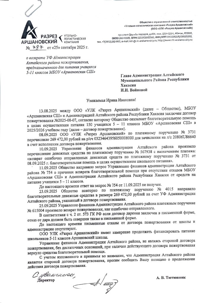 По информации СМИ «Пульс Хакасии», Аршановский разрез написал главе Алтайского района Ирине Войновой письмо, в котором указал, что от питания школьников не отказывается и поставил вопрос: какова ваша позиция по поводу возврата денег? Ответ от главы Алтайского района Республики Хакасия пока не поступил.