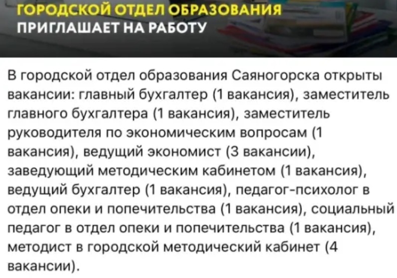 К посту депутат приложил скрин объявления с количеством вакансий в отделе образования Саяногорска.